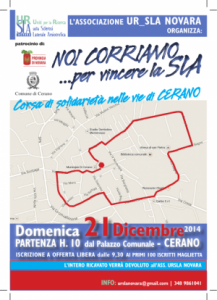 Cerano - Manifestazione podistica domenica 21 dicembre a Cerano. Partenza alle ore 10. L’intento è quello di manifestare la propria solidarietà ai malati di SLA ed ai loro familiari. L’URSLA (Uniti per la Ricerca sulla Sclerosi Laterale Amiotrofica) è da tre anni impegnata a supporto del Centro di Eccellenza SLA del Maggiore di Novara con l’istituzione di borse di studio per medici che operino nel Centro attualmente impegnato in una importante sperimentazione con cellule staminali. Per ulteriori informazioni: urslanovara@gmail.com - www.ursla.it