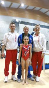 Trecate - Si sono concluse sabato 25 marzo a Torino le fasi regionali del Campionato Individuale Gold L2, cui ha preso parte anche la piccola ginnasta dell’A.D. Us Trecatese Sofia Scuteri, classificatasi all’8° posto. L’atleta, impegnata a corpo libero, trave, parallele asimmetriche, cinghietti e volteggio, ha dato il meglio di sé proprio in quest’ultimo, ottenendo il punteggio più alto fra tutti gli attrezzi. Ad accompagnare la ginnaste gli istruttori Laura Martinelli ed Enrico Corciolani e, per l’occasione, a mettersi in posa con Sofia per una foto-ricordo speciale c’è stata anche Veronica Servente, olimpionica a Barcellona ‘92. Ora la piccola Sofia dovrà solo attendere il ripescaggio per un’eventuale (e sperata) partecipazione alla fase nazionale che di terrà il 13/14 maggio a Montevarchi (Ar). All’atleta i complimenti del presidente di sezione Mario Devecchi e di tutto lo staff della polisportiva trecatese.
