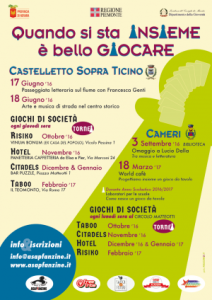 Castelletto Ticino - Cameri - "Quando si sta insieme è bello giocare", il nuovo progetto si prepara per la sua fase più viva e aggregativa: una ricca serie di tornei di giochi di società che si svolgeranno a Castelletto Ticino e a Cameri, nel novarese, e che ci accompagneranno nei prossimi mesi autunnali e invernali. I tornei si svolgeranno a cadenza regolare in un giorno fisso della settimana: il giovedì sera a Castelletto Ticino e il lunedì sera a Cameri. Di settimana in settimana seguiremo l'evoluzione dei giochi, dando vita ad un torneo che coinvolgerà tutti i partecipanti. Saranno ben quattro i giochi che ci accompagneranno nelle varie serate: Risiko, Taboo, Hotel e Citadels. Di seguito il programma di Castelletto e quello di Cameri. Per iscrivervi e per maggiori informazioni inviate una mail a:info@asapfanzine.it.