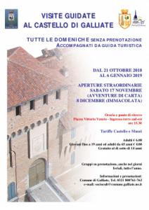 Galliate - Dal 21 ottobre riprendono le visite guidate al Castello. Le visite, tutte le domeniche, possono essere fatte senza prenotazione e accompagnati da guida turistica. Aperture straordinarie: sabato 17 novembre (in occasione della manifestazione “Avventure di carta”), sabato 8 dicembre. Ritrovo ore 15.30, Piazza Vittorio Veneto - Ingresso torre sud-est (ultimo ingresso del Castello, verso il largo Remo Rabellotti).