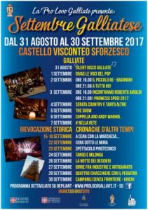 Galliate - Un mese intero (settembre) di eventi a Galliate insieme a Pro Loco e Comune al Castello Visconteo Sforzesco. L’1 si comincia con Divas le Voci del Pop. Il 2 alle 16 Il Piccolo Re - Bagonghi; alle 21 A tutto Bo!. Il 3 alle 16 incontriamo Roberto Airoldi; alle 21 I Promessi sposi 2017. Il 4 serata Country e tanto altro. Il 5 The Show. Il 6 Coppelia and And Andy Warhol. Il 7 #nella Rete. Quindi spazio alla rievocazione storica - cronache di altri tempi: il 15 e 16 a cena con la Marchesa. Il 22 cena sotto le mura. Il 23 spettacolo pirotecnico. Il 24 Tango e milonga. Il 26 La notte dei desideri. Il 27 birre tra industrie e artigianato. Il 29 quattro chiacchiere con il pediatra. Infine il 30 campanili senza frontiere - giochi. Il programma dettagliato di tutti gli eventi è sul depliant che si può scaricare su www.prolocogalliate.it. Tutti gli eventi sono ad ingresso gratuito.