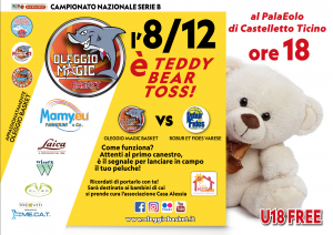 Oleggio - Torna l’appuntamento con la solidarietà, uno fra i più attesi della stagione. In occasione del match casalingo contro la Robur et Fides Varese, che si terrà sabato 8 dicembre al PalaEolo alle 18 (orario speciale perché festivo) torna il Teddy Bear Toss, giunto alla sua terza edizione. Tutto il pubblico è invitato a partecipare alla partita con un peluche da lanciare in campo dopo il primo canestro della sfida! E per il terzo anno si rinnova l’amicizia sempre più preziosa e solida con Casa Alessia, l’associazione novarese che si occupa di bambini bisognosi in tutto il mondo. I destinatari saranno proprio loro, i piccoli cui periodicamente fanno visita i numerosi volontari dell’associazione. Nelle due stagioni passate i peluche raccolti hanno portato sorrisi in Ecuador e Mozambico, una meravigliosa emozioni ricevere le loro fotografie sorridenti!