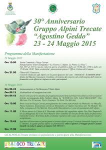 Trecate - Domenica 24 maggio in concomitanza con la commemorazione del Centenario della Prima Guerra Mondiale, si celebra anche il 30° Anniversario della fondazione della sezione trecatese dell’Associazione Nazionale Alpini, il Gruppo “A. Geddo”. Per celebrare questo doppio anniversario, il Gruppo ha predisposto per il fine settimana 23 e 24 maggio un ricco programma, che prevede tra l’altro una mostra fotografica presso il Teatro comunale, il concerto dell’Amadeus Kammerchor, un corteo per le vie cittadine accompagnato dalla Fanfara Alpina, con deposizione di una corona di alloro al Monumento ai Caduti, e celebrazione della S. Messa presso la Chiesa di San Bernardo, con animazione liturgica a cura del Coro Voci Bianche “Don Gregorio Gambino”.