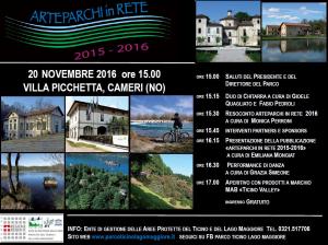 Cameri - Domenica 20 novembre a Villa Picchetta a Cameri a partire dalle ore 15 si tiene l'evento conclusivo della 2^ edizione di "Arteparchi in rete" svoltasi nei territori delle aree protette gestite dall'Ente e nell'area MAB UNESCO Valle del Ticino. Ci sarà un resoconto dell'iniziativa e presentazione della nuova pubblicazione "Arteparchi in rete 2015-2016" con distribuzione gratuita. Durante l'evento performances di musica e danza con aperitivo finale a base di prodotti a Marchio MAB "Ticino Valley". Gli ospiti: il duo musicale composto da Gioele Quagliato e Fabio Pedroli, Monica Perroni, Emiliana Mongiat e Grazia Simeone. Per ulteriori informazioni tel. 0321 517706.