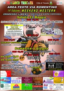 Trecate - Il prossimo 31 maggio e 1° giugno si svolgerà presso l’Area Feste di Via Romentino a Trecate la 14^ edizione del Weekend Western organizzata dalla Pro Loco Trecate; numerosi gli eventi in programma. Apertura manifestazione sabato alle ore 16 con il battesimo della sella aperto a tutti (grandi e picconi all’interno della zona cintata) a cura di ASD Athena Pony Club e Ranch “Mauritius”. Sino alle ore 24 si potranno seguire prove di Team Penning , balli Country con il DJ Saverio e cenare con Menù Tipico Western.